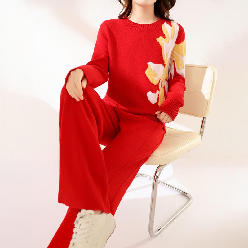 秋冬新作2ピースセット100ピュアウールラウンドネックレディース刺繍プリントデザインセンスセーターズボンセットファッション