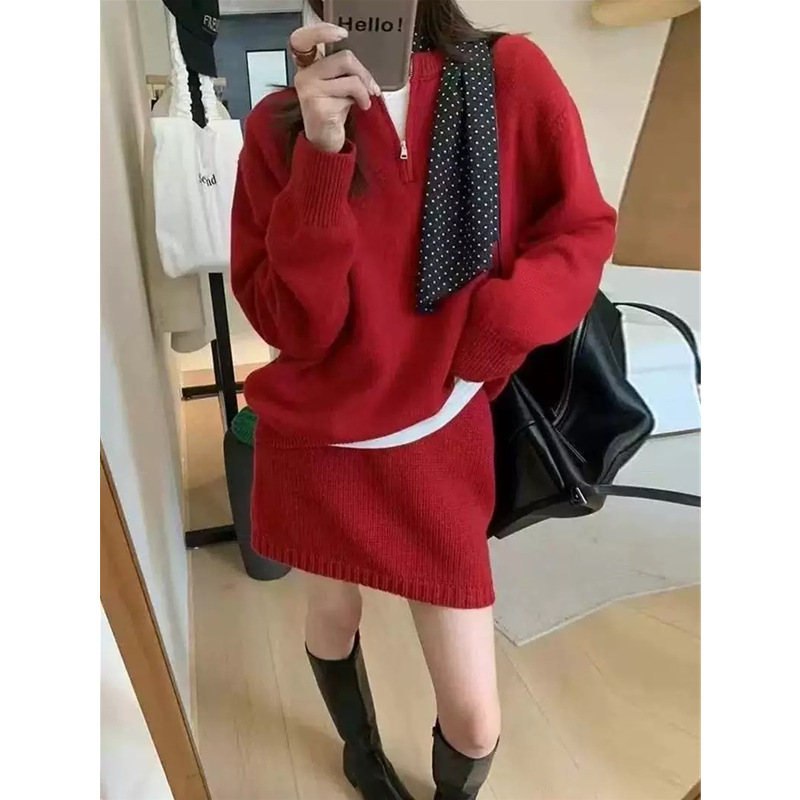 新年の赤い半ファスナーのカシミヤのニットのスカートの2つのセットの女性の秋冬のフレンチの短い種類のウールのセーターのスーツ