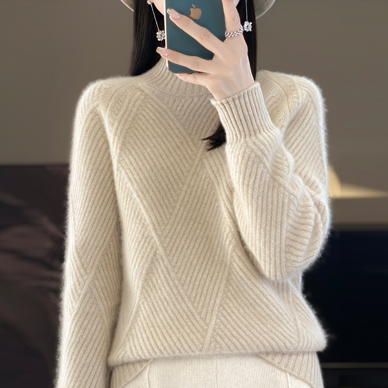 2025秋冬新作 純毛レディース厚手ハーフタートルネック菱形斜めストライプおしゃれ通勤保温セーター