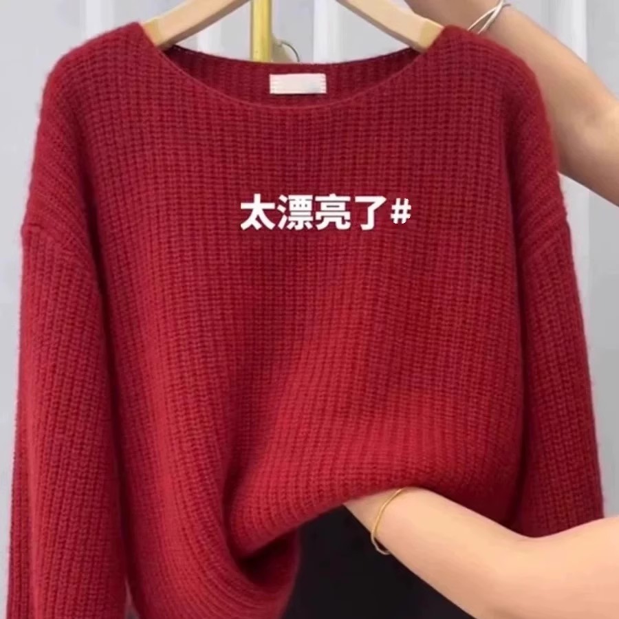 冬の一字襟のカシミヤの長袖の本命年のプルオーバーのセーターの女性のゆるい新年の赤いウールのニットは底を打ちます。