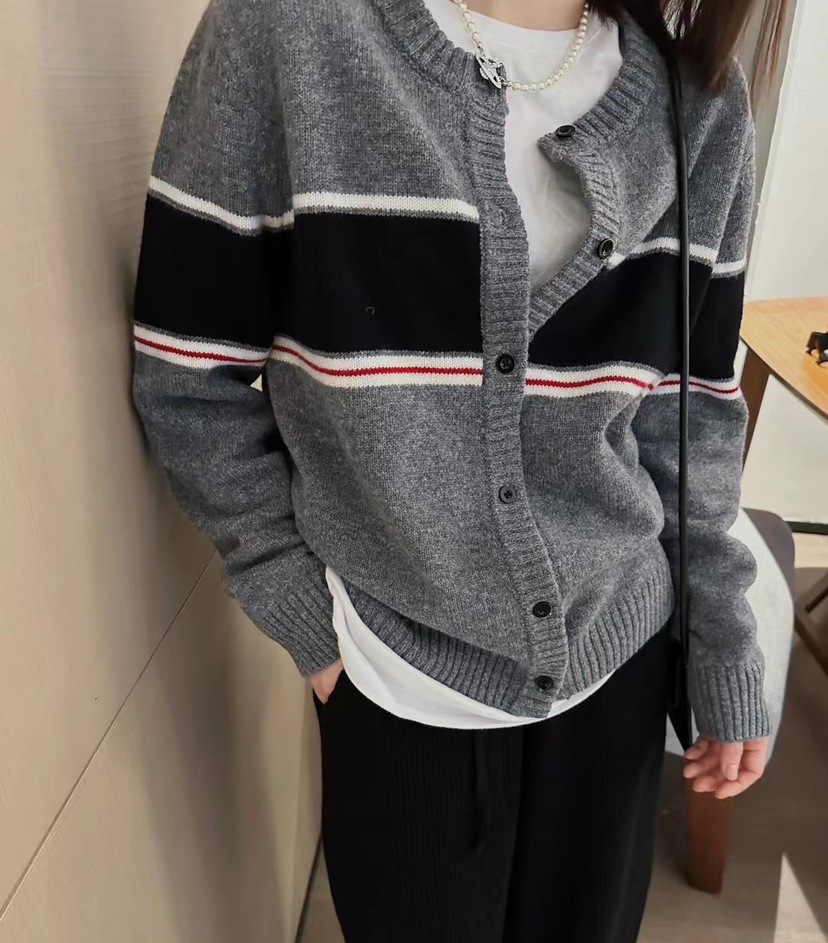韓国版の色合わせ2023春秋ストライプの単列はウールのセーターの女性のセーターのカーディガンを掛けます。