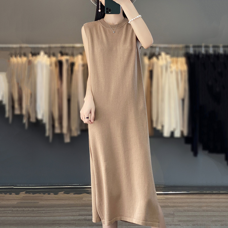 2023丸首のワンピース女性ニットの中の長さは袖なしの春夏女装を着ている