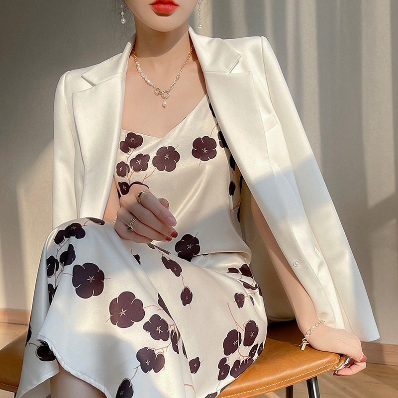 2023年春新作レディース模造シルクストラップノースリーブハイウエスト花柄ワンピースセクシー通勤オシャレロングスカート