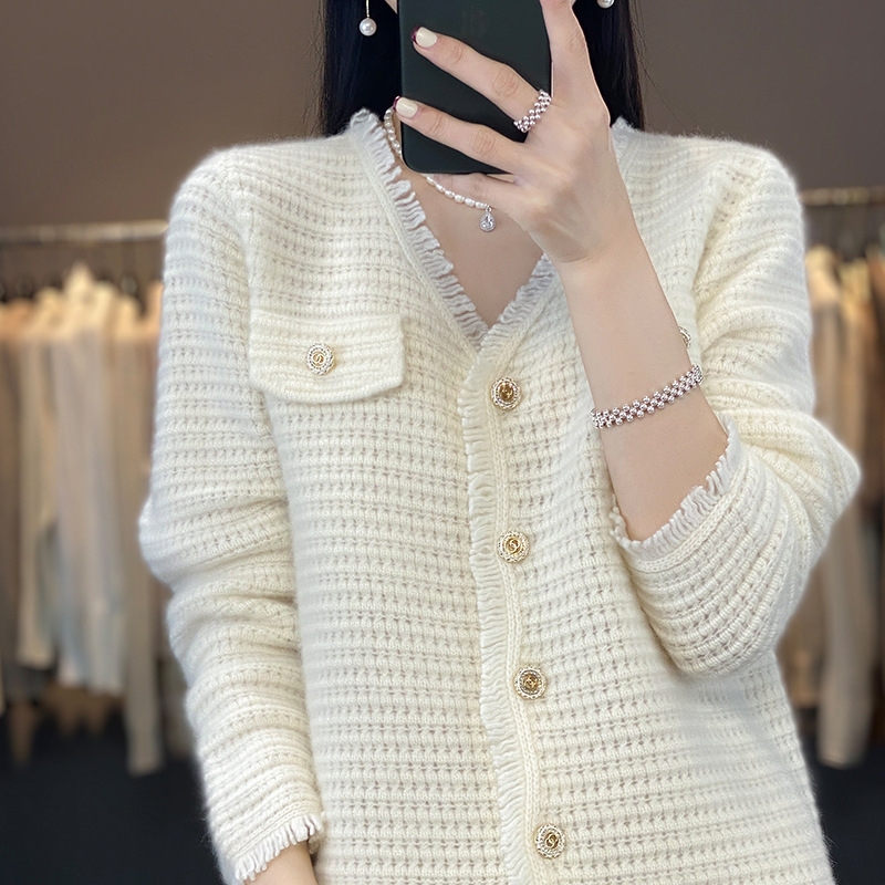 小香風毛辺純色セーター女性ウールカーディガン女装2024春新作ファッションウールニットコート女性