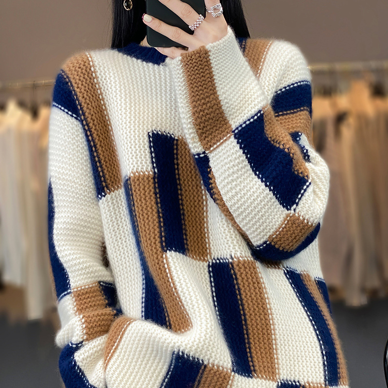 欧品のウールのセーターの女性の毛の中に秋冬のゆったりしている百合の頭の洋風のセーターの白い高襟の底のニットを掛けます。