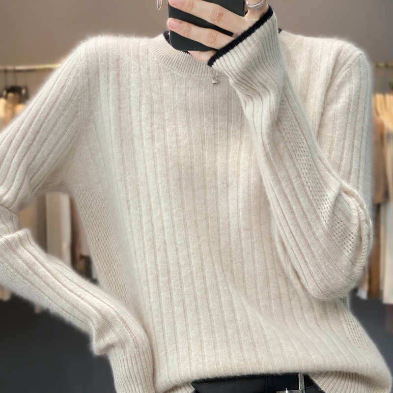 やせて見える丸首の色合わせ100ウールの底のシャツの女性2023年秋冬の新型の韓国系のプルオーバーのセーターのファッション