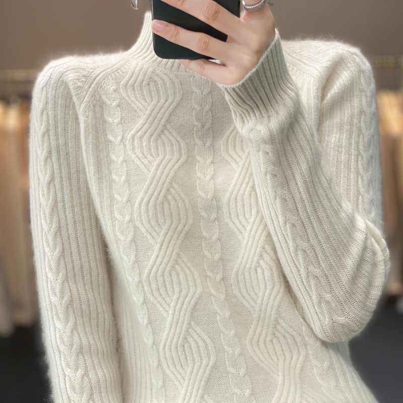 重工ツイスト花厚手半高襟100ウールシャツ女2023年秋冬新作ニット韓系プルオーバーセーター