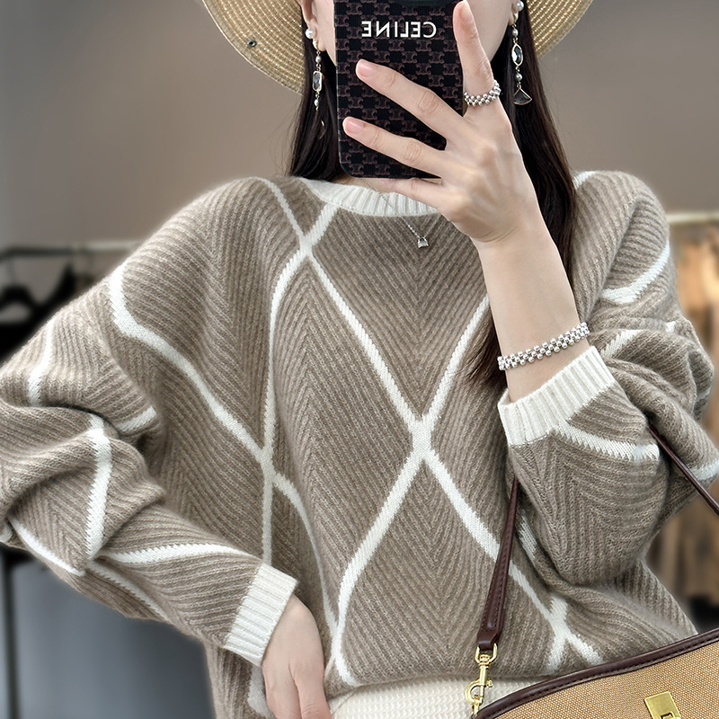 オールウールレディース2025新作レトロ風質感菱形格子柄ジャカードウールニットゆったりセーター