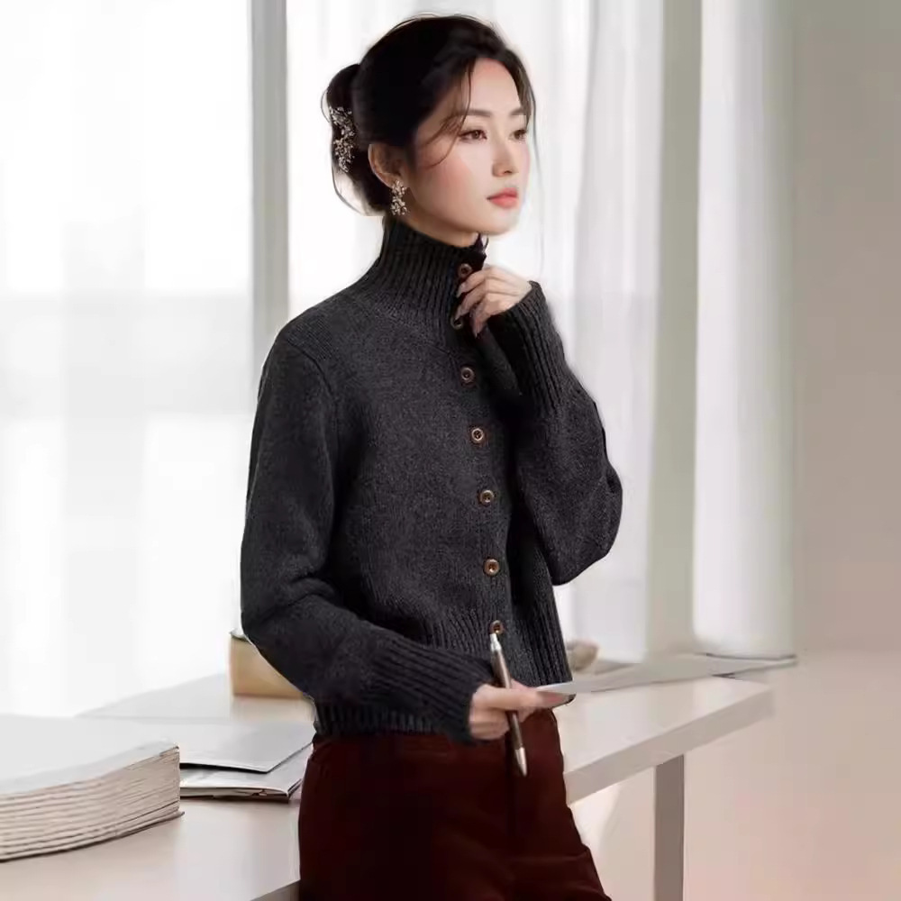 柔らかいモチモチ秋冬の高襟の洋気のカシミヤのカーディガンの女性のゆったりしていて怠惰な風のウールのニットの復古のコートは底を打ちます。