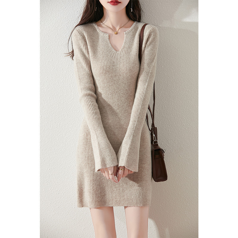 25年秋冬新作、純毛Vネックニットワンピース、レディース、ストライプ柄、無地、スリムフィット、ヒップを包み込むミディ丈ワンピース