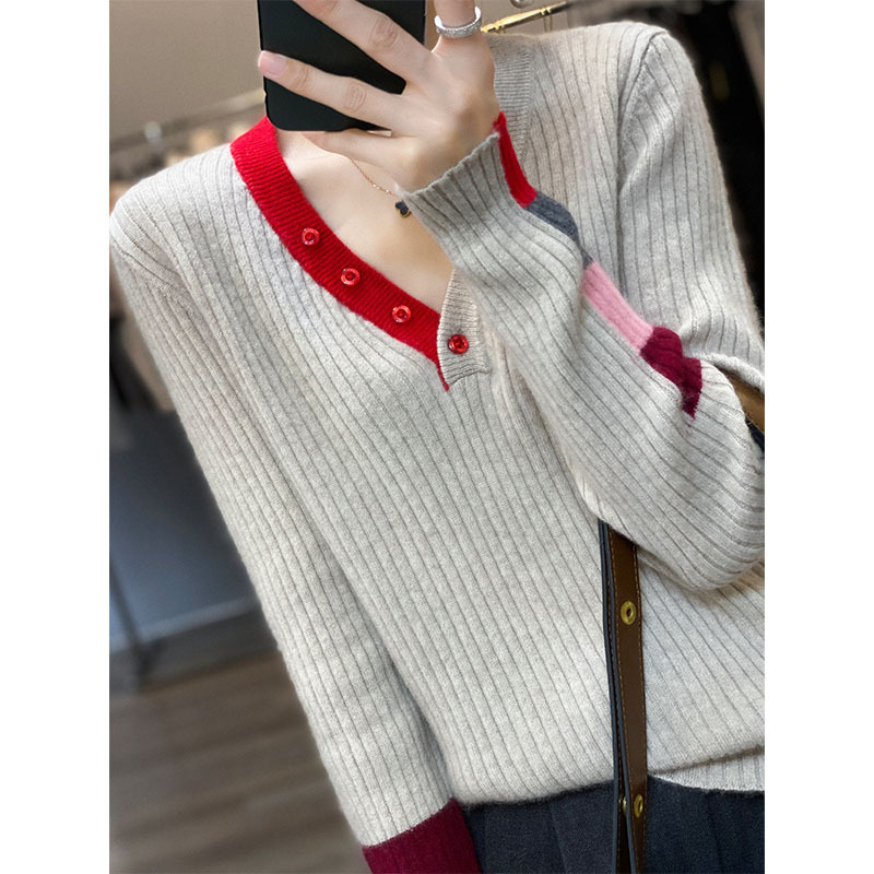 2023年秋冬新作女性用純ウールプルオーバーニット女性インナー通常版vネックセーターベースシャツ