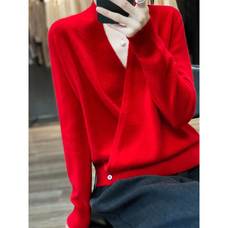 秋冬の新型ウールのカーディガンの女性の小さい大衆のデザイン感vネックのボタンのオーバーのセーターは交差して外にカシミヤのシャツを掛けます。