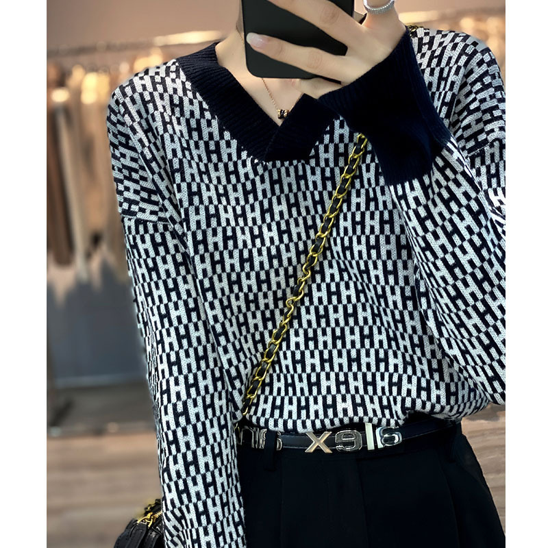 Vネック秋冬新作ニットセーター女性100純ウール全身ジャカードhタイプのプルオーバー