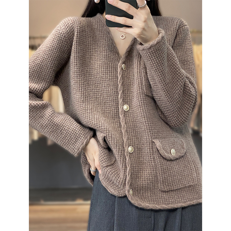秋冬の新型の小香風vネックのカシミヤのカーディガンの女性のワッフルのゆったりしているセーターの長袖はやせているウールのニットを現します。