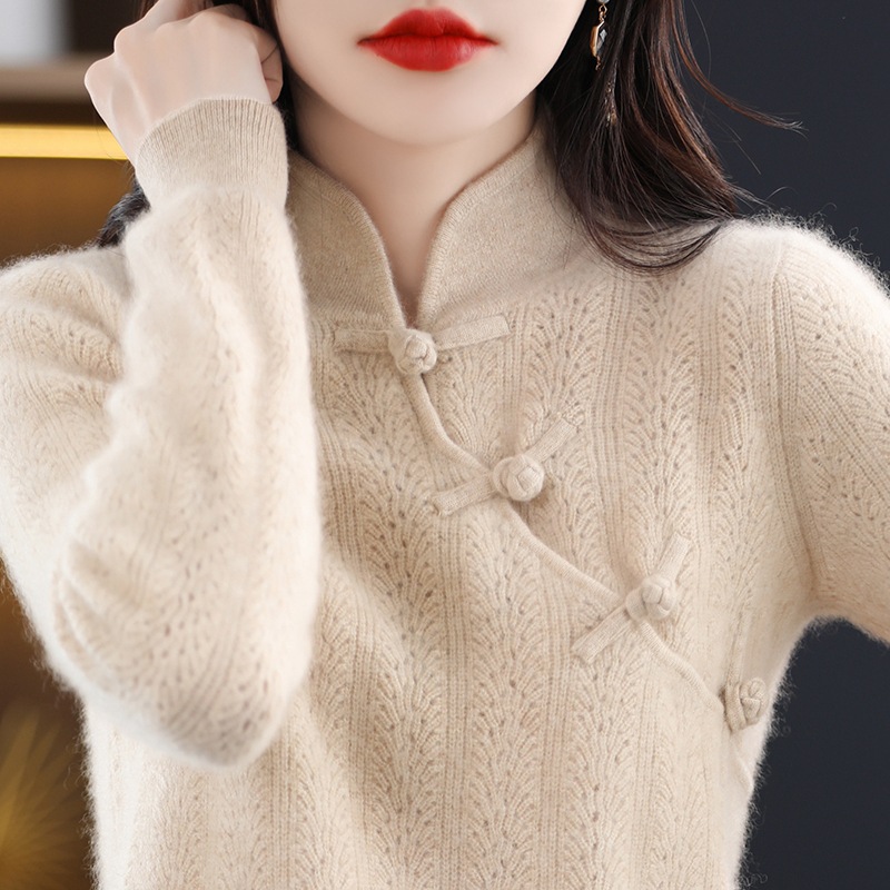 中国式の復古風盤は底のウールのニットの2023の新型のゆったりしている半高襟の頭の中でセーターの女性を掛けます。