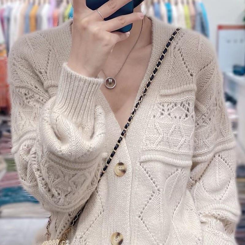 秋冬の新型カーディガンの女性vネックの菱の形のゆったりしたウールのカーディガンの100コートのカシミヤの長袖の外着の女性の透かし彫り