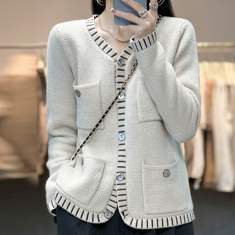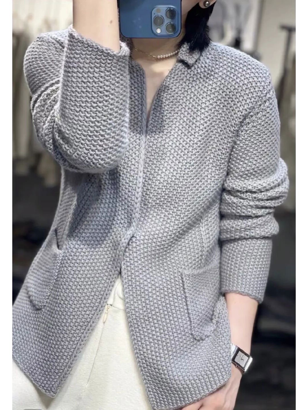 2025秋冬新作ウールセーター女性用ネイビーカラー透かし編みセーターカシミヤジャケットニットカーディガンゆったり厚手