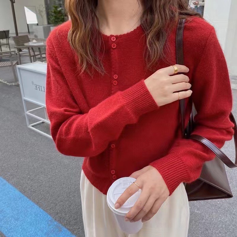 2023秋冬の短い丸首ニットのカーディガンのセーターの女性はゆったりとしています。