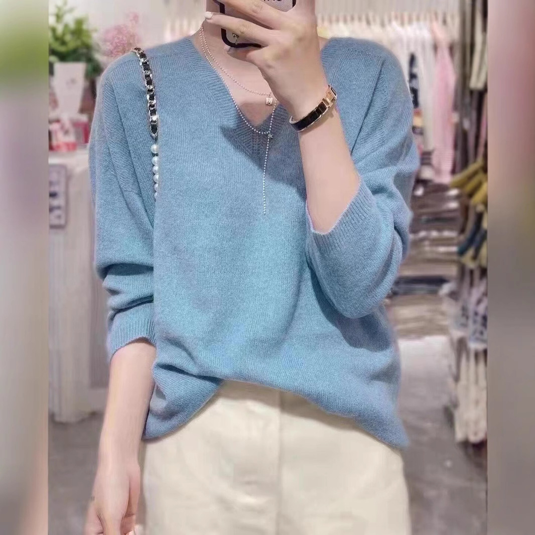 2023年秋冬新作ウールニット女性vネック韓国風ゆるい長袖プルオーバー