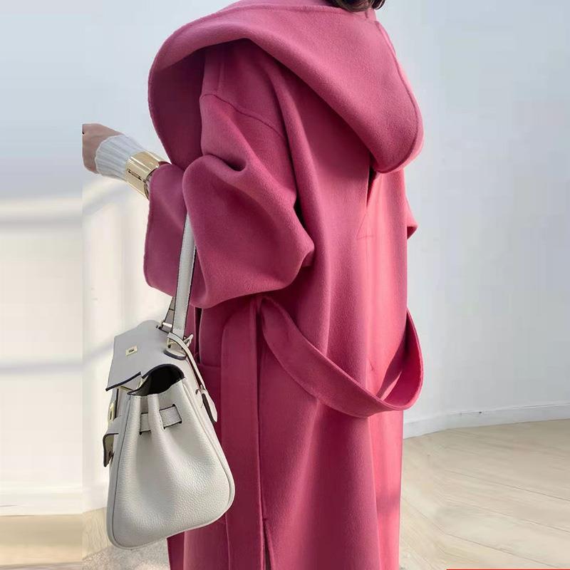 ローズレッドのフード付き両面カシミヤコート、女性用ミドル丈、2025秋冬新作、ゆったりとした厚手のウールコート