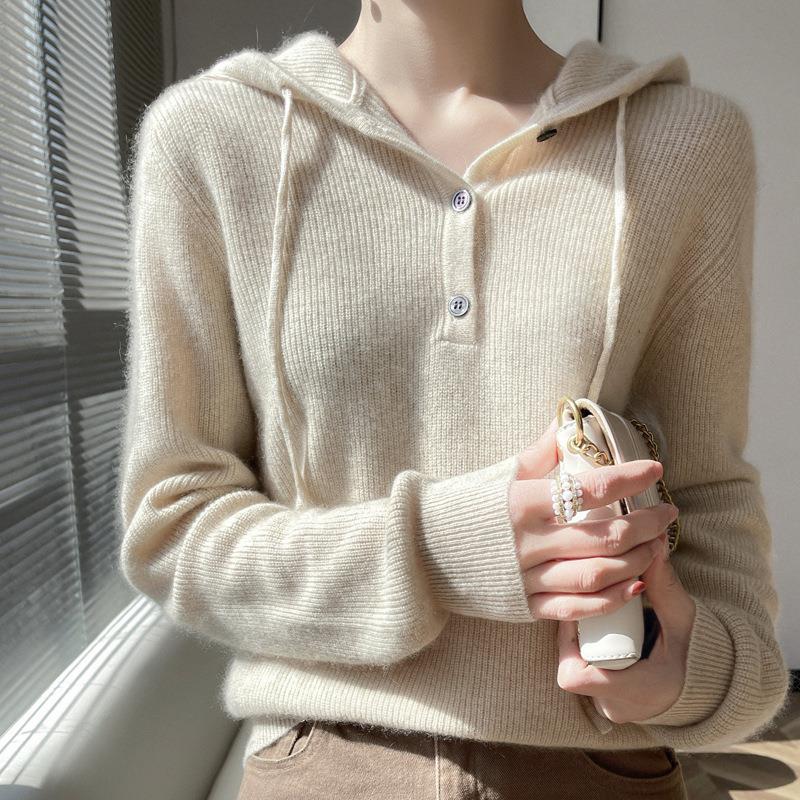 2023新型カシミヤニットと帽子付きの女性春秋ウールのセーターを厚くして、パーカーの外にセーターを着ます。