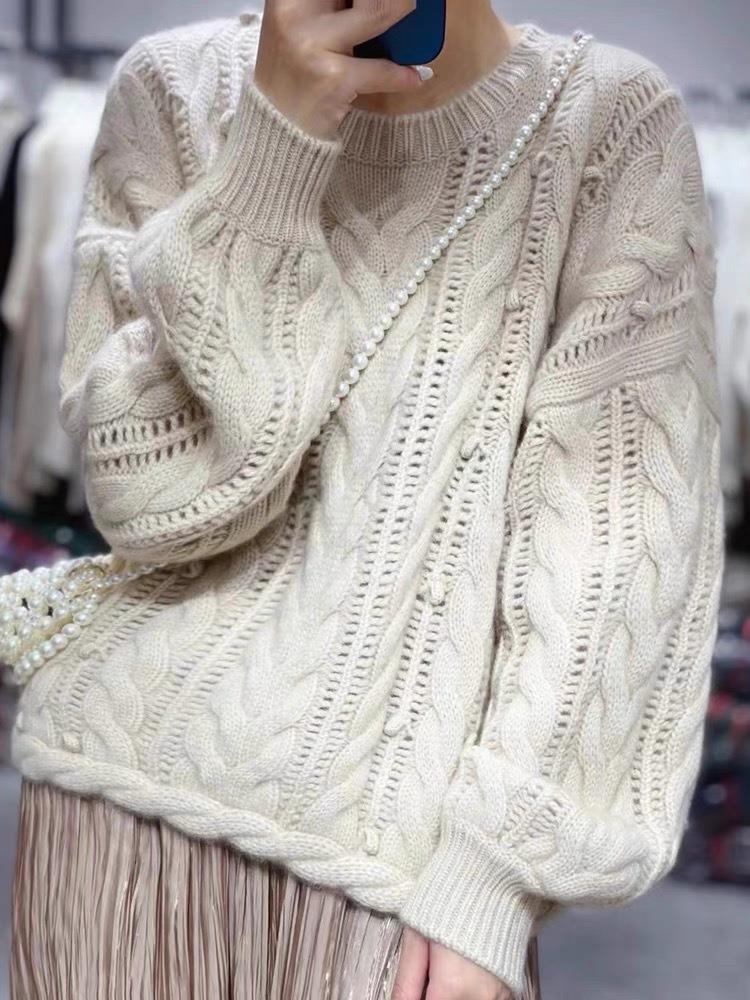 2023秋冬の新型カシミヤ丸首長袖透かし彫り韓国版ゆるいファッションウールニット上着の外着ファッション