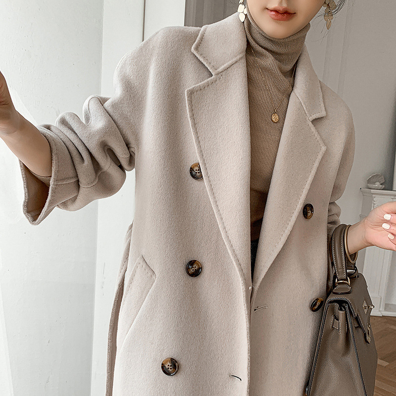 両面のカシミヤのコートの純色のベルトの長いダブルボタンはウールの毛を着ます。