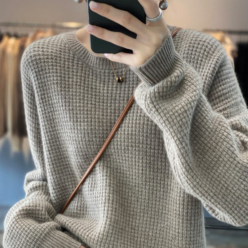 純色の丸首の純ウールのニットは頭をかぶせてゆったりしています。