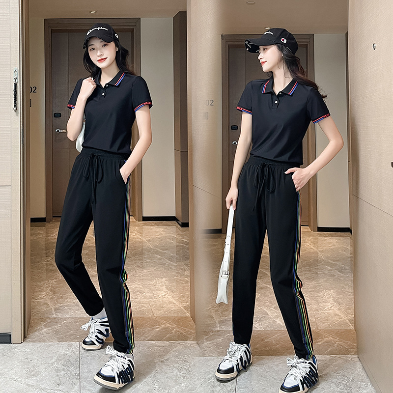 カジュアルスポーツスーツ女性2023夏の新型ゆるい痩せたpoloシャツの上着の足の広いズボンの2つのセット