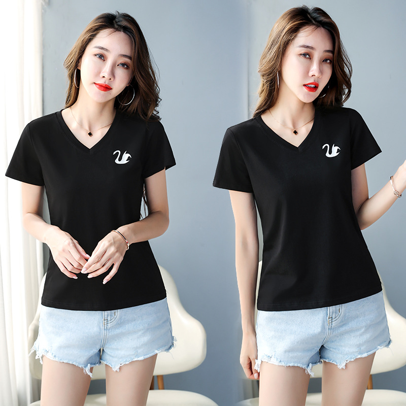 個性プリント2023年夏の新型ファッションvネックの肩の半袖tシャツの女性の洋気はやせています。