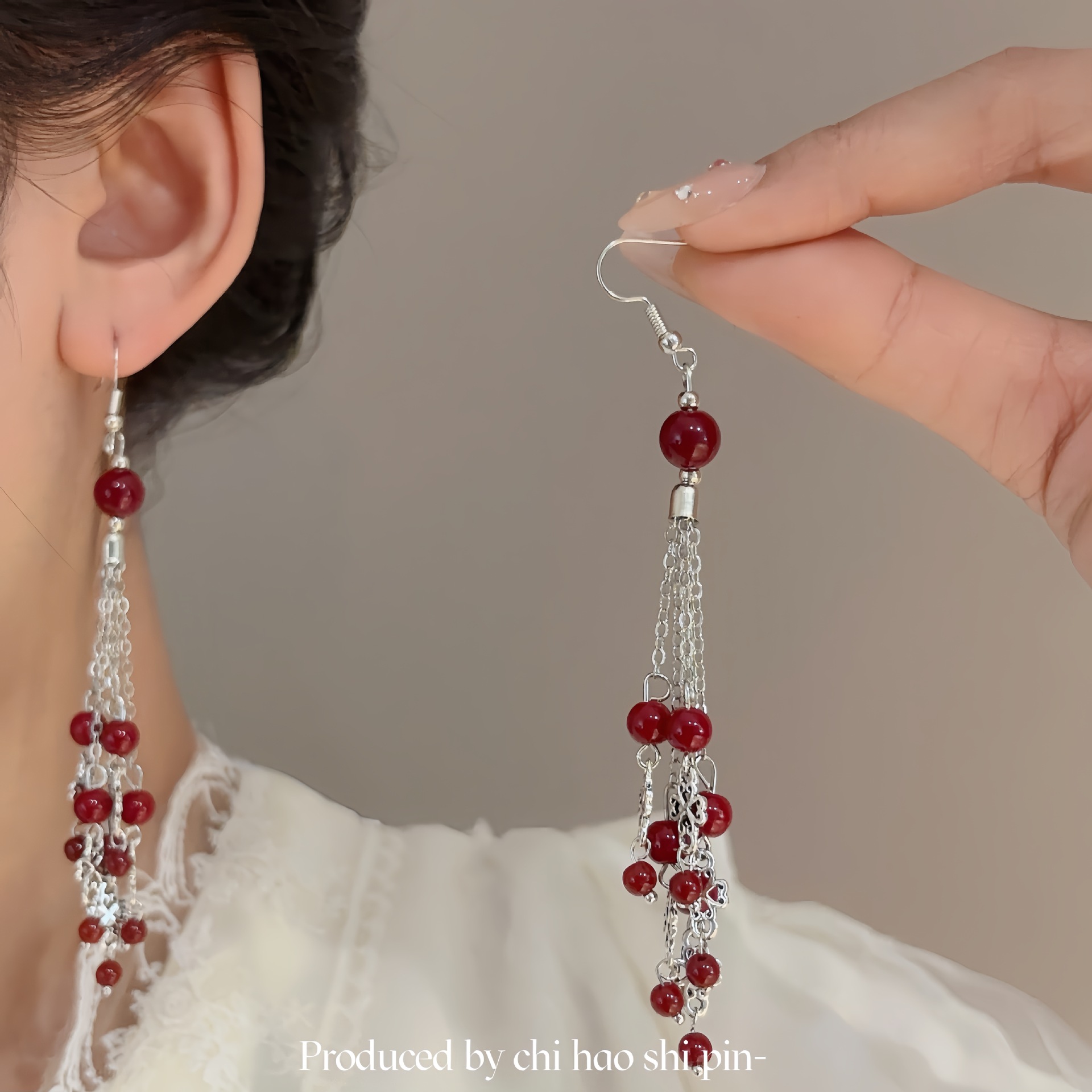 Yirenxia Mendoと同じスタイルの新しい中国風のレトロな赤いビーズのイヤリング、エスニックスタイルのタッセルデザインの女性用イヤリング