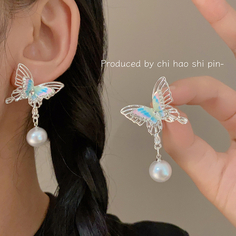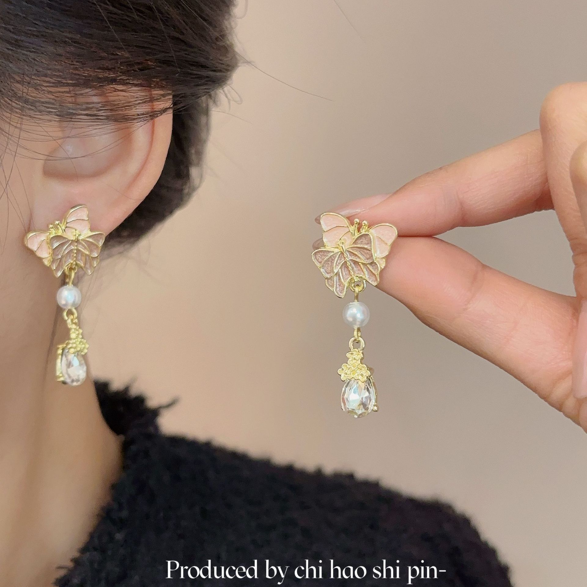 「粉蝶藍夢」新中国式粉青滴釉薬蝶真珠ピアス