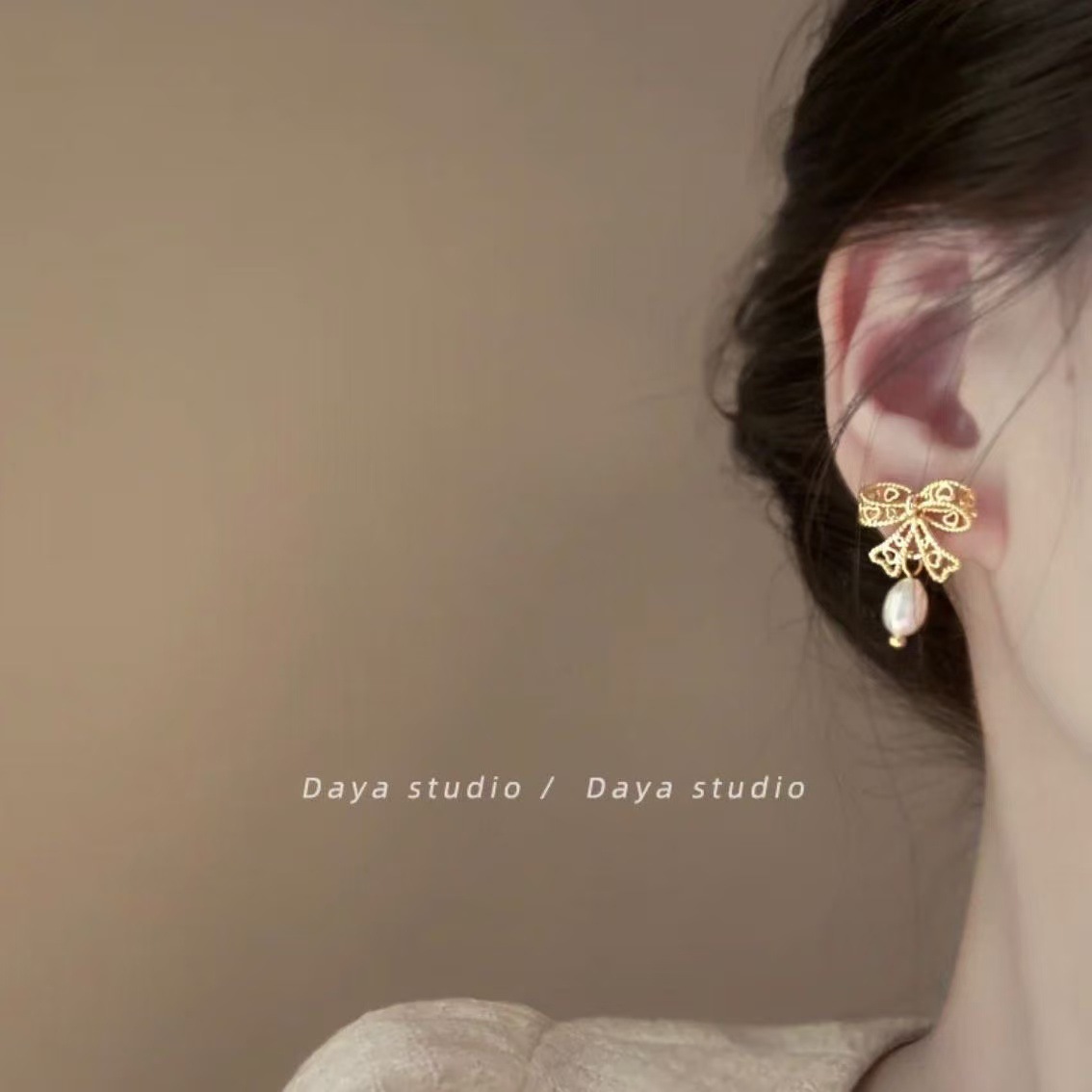 少女のリボンはフランス風のレトロな透かし彫りの蝶結びのイヤリングです。