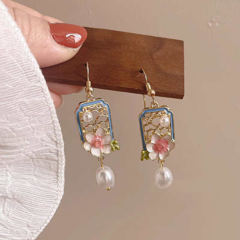 新しい中国風の透かし彫りの釉薬の花の真珠のイヤリングの女性の金の2025新型の高級感のファッションの百合のピアスのイヤリング