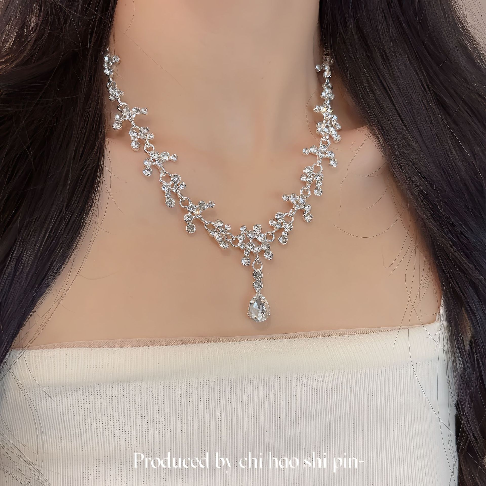 キラキラ花水滴ネックレスイヤリングセットレトロ宮廷風軽豪華気質高級感タキシード鎖