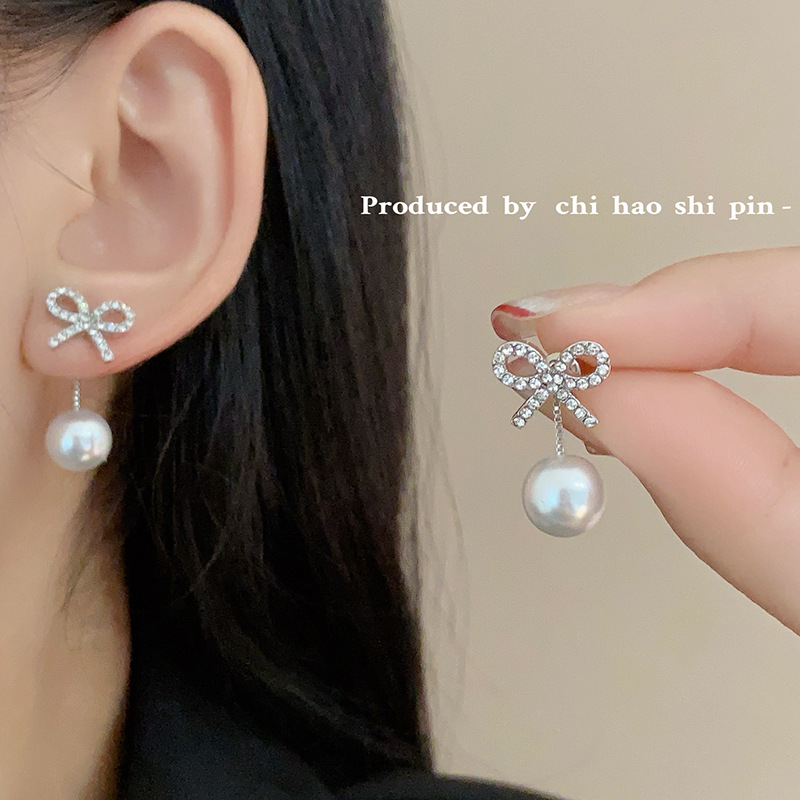 秋に似合う超フラッシュジルコン蝶結び真珠イヤリング