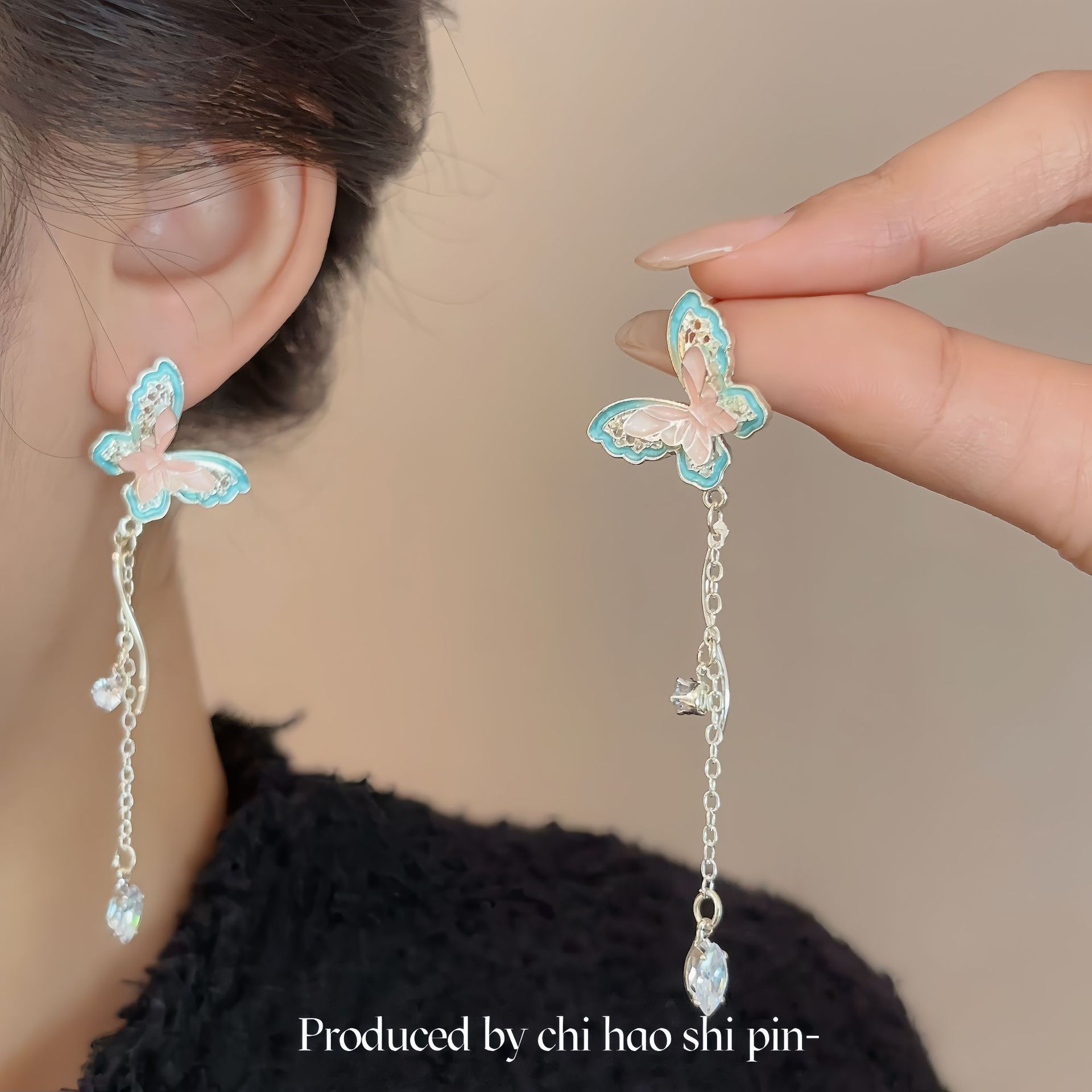 ピンクの蝶の青い夢 ~ 甘い風の滴る油の透かし彫りの蝶のピアスの女性の2024夏の新型の小さい大衆の同型のイヤリング