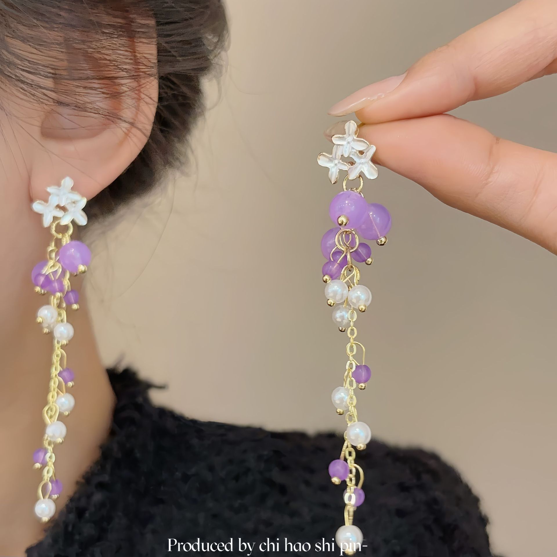 銀の針の小さい清新な紫色の花のフリンジイヤリングの甘い設計のピアスのネットの赤い気質の小さい大衆の百合の耳飾りの女性