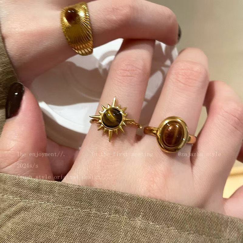 レトロな金色の太陽の花は虎の目の石の指輪をまねます。