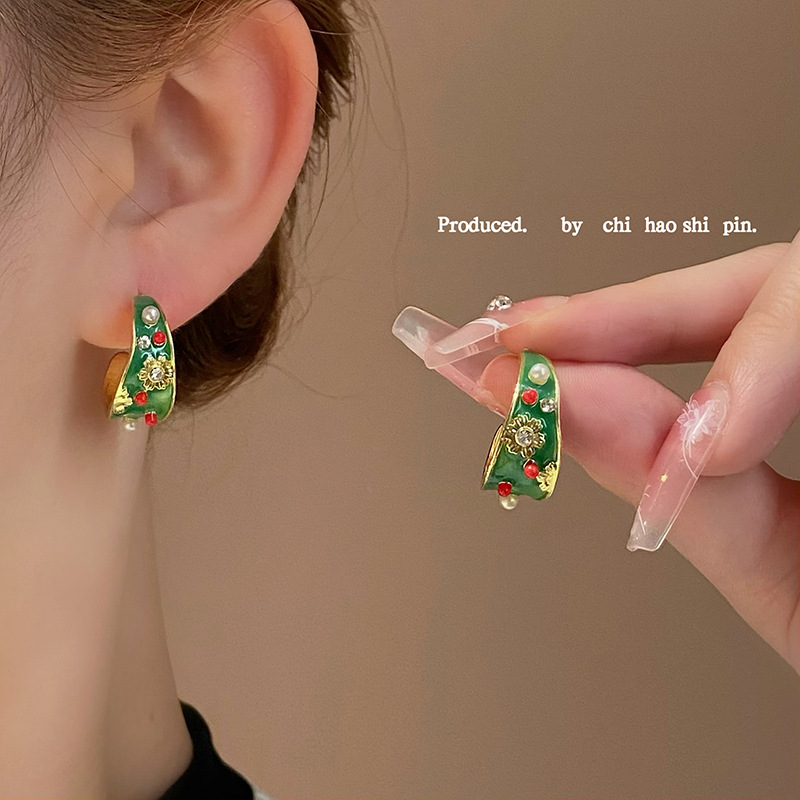 新中国風煙水緑エナメル模造真珠花ピアス小衆軽贅沢ファッション高級感百合耳飾り