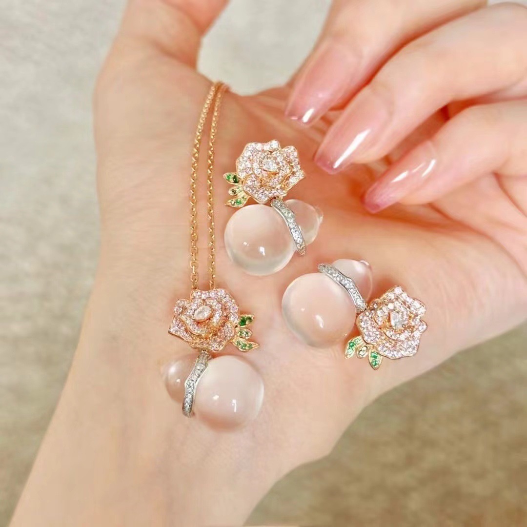 ヨーロッパとアメリカのカラーダイヤモンド、優しいピンクの花のイヤリング、高級フレンチ宮殿スタイルのイヤリング、ファッショナブルで重厚な気質のイヤリング