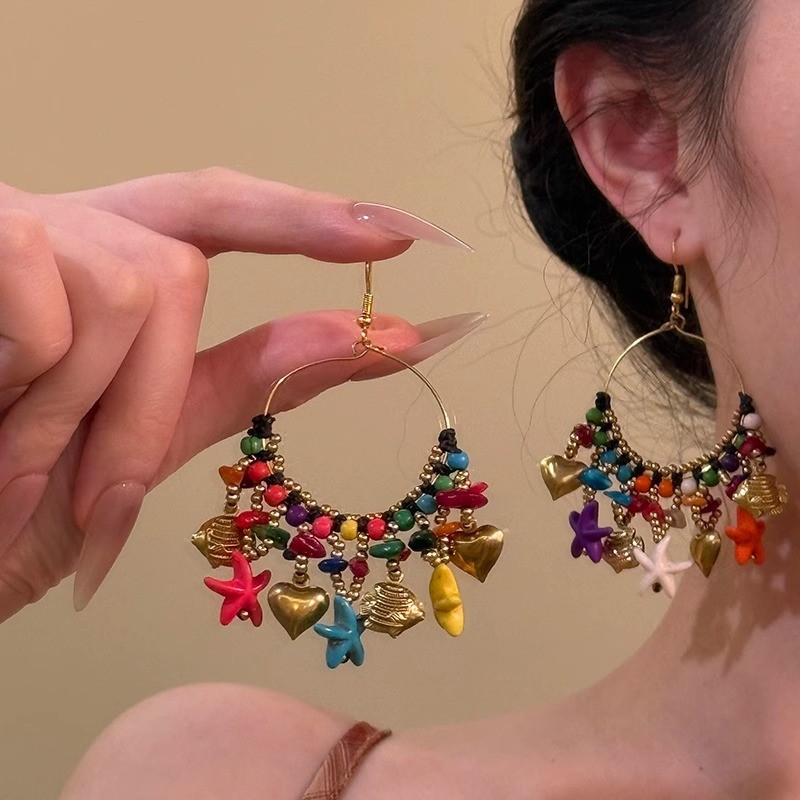 海边假日~复古彩色串珠流苏耳环女波西米亚度假风耳钉独特耳饰品