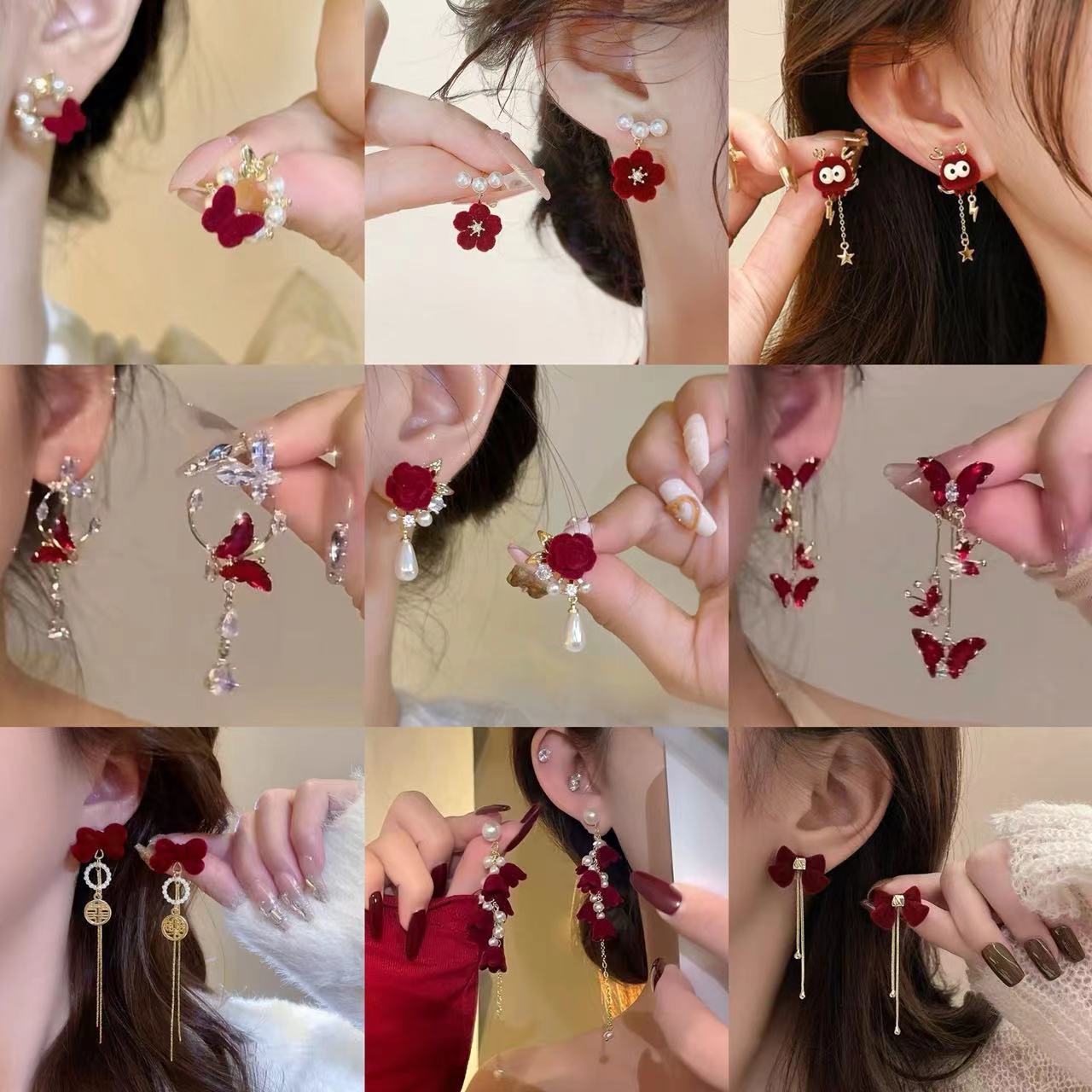 新年の雰囲気感赤系植毛イヤリング愛花蝶結び真珠ピアスレトロ秋冬耳飾り