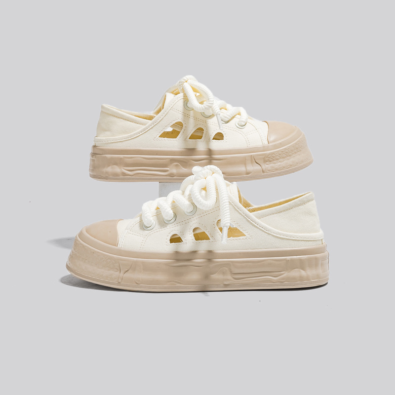 2023夏の新しい通気性の透かし彫りの白い靴の女性の半分はレジャーの学生の厚い底のキャンバスの靴を引っ張ります。
