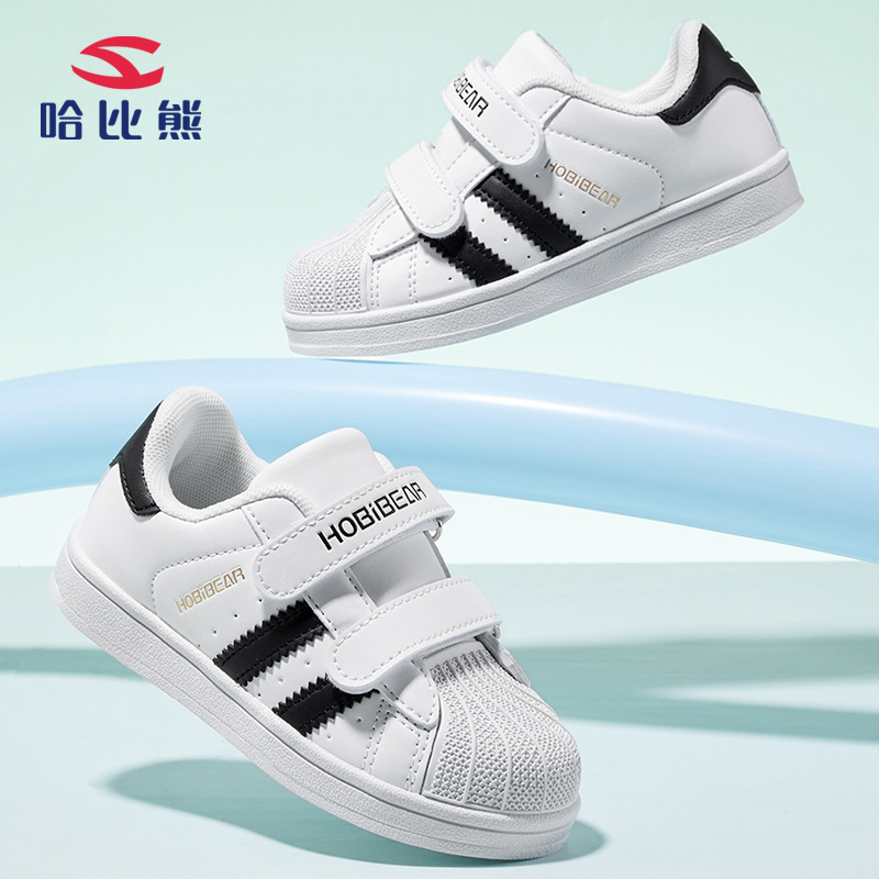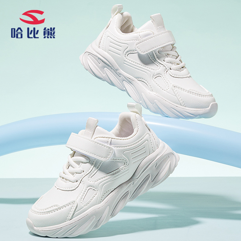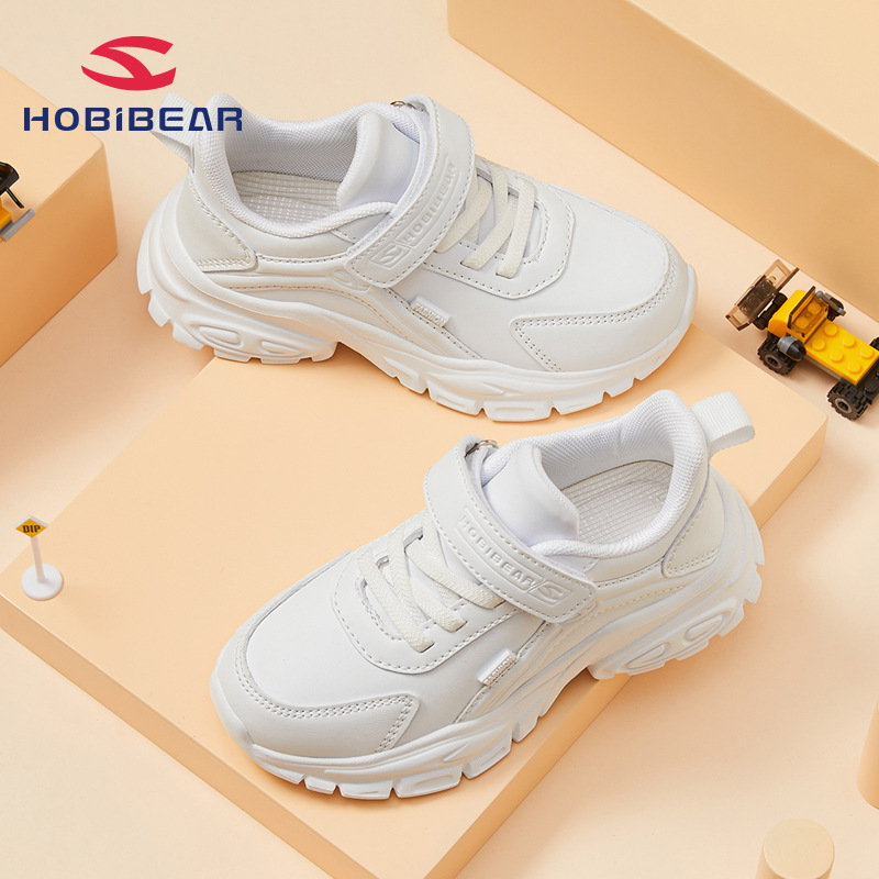 HOBIBEARブランドの子供靴、男の子用汚れに強い革製軽量スポーツシューズ、女の子用白い靴、マジックテープデザイン