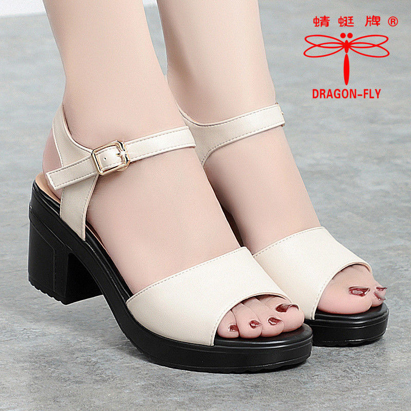 本革キャットウォークサンダル女性ミディアムヒール厚いヒール夏の新しい防水プラットフォーム大きいサイズママサンダル
