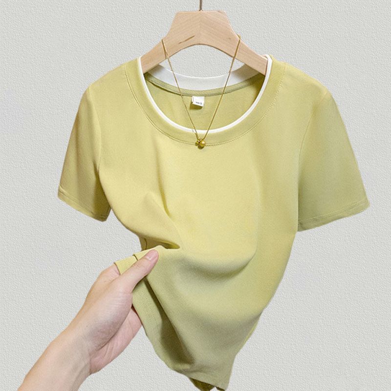 純綿プラスサイズレディース夏新作フェイクツーピースコントラストカラー半袖Tシャツレディース右肩ラウンドネックカバー肉痩せトップ
