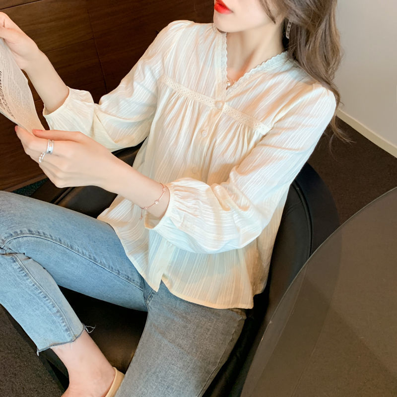綿とリネンのシャツフェアリートップ2021春と秋の新しいスーパーフェアリー気質Vネックレースシャツ西洋スタイルのファッショナブルな長袖シャツ