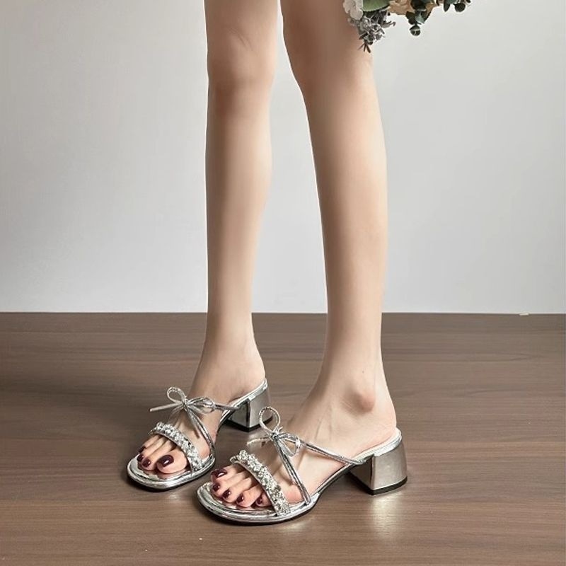 スーパーフェアリーサンダル女性のための 2025 夏の新しいスタイルのリボンフレンチラインストーンサンダルアウターウェア太いヒールハイヒール