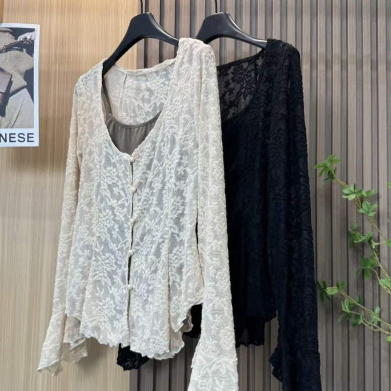 プラスサイズの純粋な欲望のセクシーなレースの気質早春ホットガールトップキャミソールツーピースセットフレアスリーブカーディガン